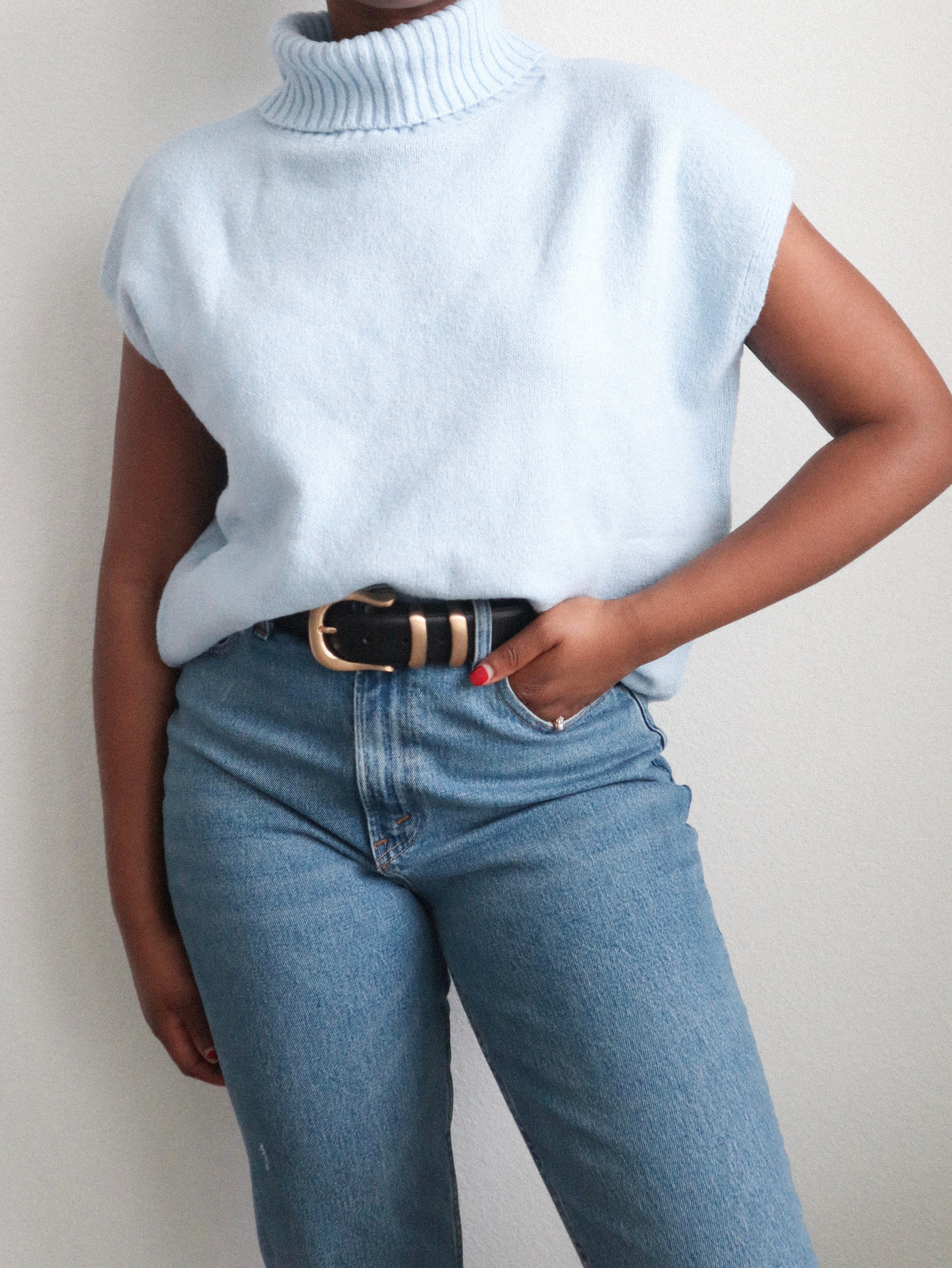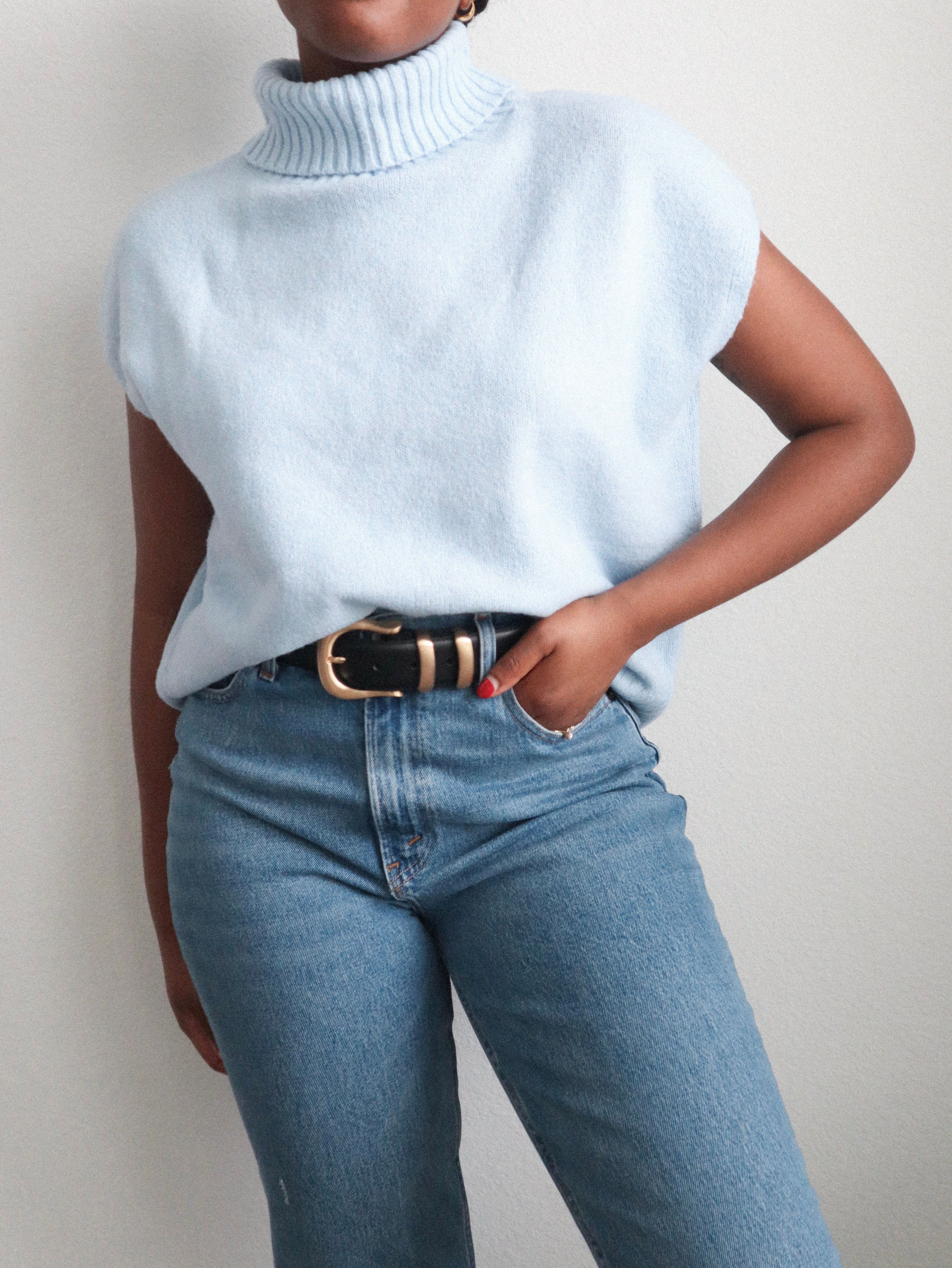 This sleeveless knit vest comes in a lovely baby blue hue, complete with a turtleneck. Ideal for the spring season!